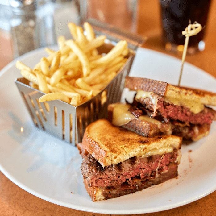 Pastrami or Corned Beef with Sauerkraut on Rye, topped with Melted Swiss Cheese, served with French Fries & Russian Dressing.