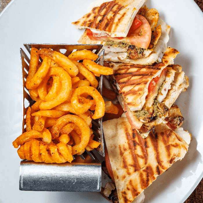 Marinated Grilled Chicken on a Buttered Pretzel Roll topped with Pepper Jack Cheese, Baby Spinach, Sliced Apple & Cranberry Mayo, served with French Fries.