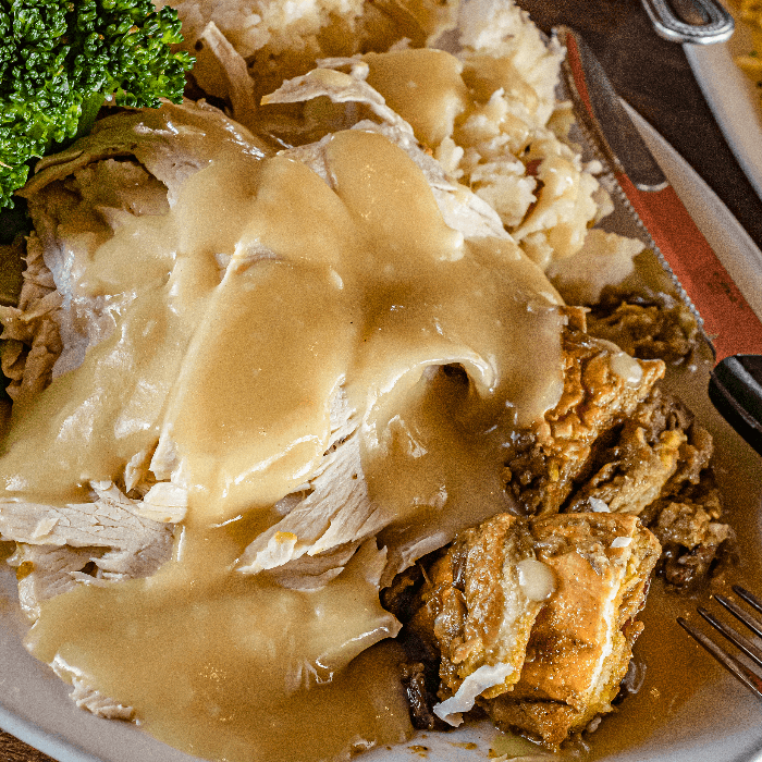 Layers of Turkey on Traditional Stuffing served with Turkey Gravy & Cranberry Sauce with Choice of Potato & Vegetable.